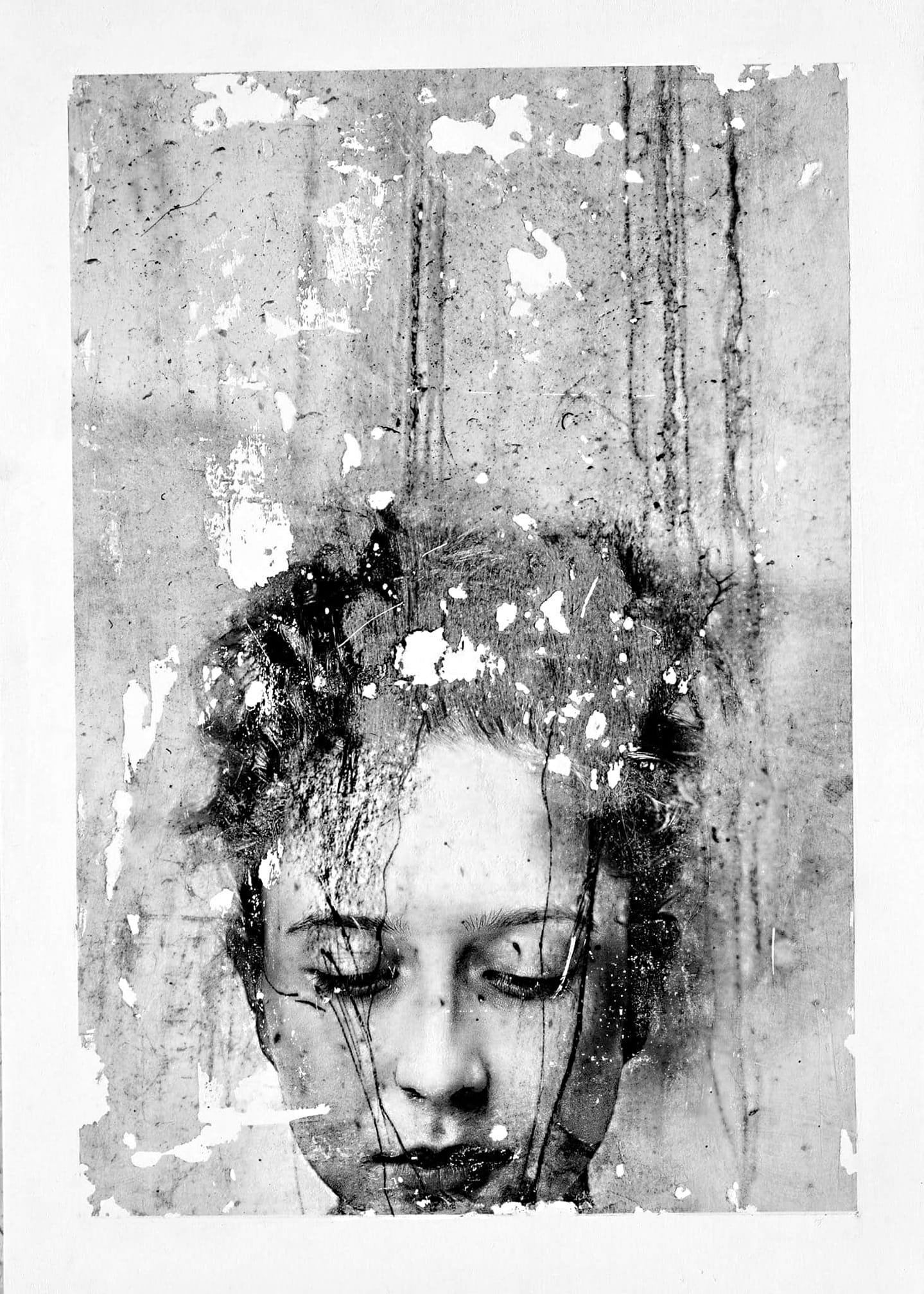 In questa opera in bianco e nero, corrosa e lirica, assistiamo a una potente fusione tra immagine e superficie, tra volto umano e parete consumata. L’opera, che sembra nascere da un processo misto di stampa, deterioramento e manipolazione materica, esprime un’intensità che va oltre la pura rappresentazione: qui la fotografia diventa pelle, traccia, ferita. Il volto femminile, con gli occhi chiusi e le labbra leggermente dischiuse, appare immerso in uno stato di sospensione meditativa, quasi mistica. Eppure non siamo davanti a un semplice ritratto: il viso affiora dalla superficie come un’epifania fragile, parzialmente cancellata, aggredita da muffe visive, da scrostature e graffi che non nascondono ma rivelano. La materia stessa dell’immagine diventa parte del linguaggio espressivo. Il supporto mostra segni evidenti di usura e deterioramento. L’effetto finale è quello di una memoria fotografica contaminata dal tempo, come se l’immagine fosse stata dimenticata in uno scantinato umido e solo ora riportata alla luce, senza restauri. I residui della parete – gocce, colature, macchie – si fondono con i tratti della ragazza, fino a far pensare che si tratti di una fusione tra carne e muro, tra identità e rovina. L’opera interroga così il rapporto tra soggettività e oblio, tra presenza e cancellazione. Il volto della giovane non ci guarda: non si offre allo spettatore, ma si raccoglie in sé stesso. In questa chiusura silenziosa risiede una forza che si oppone allo sguardo dominante. È un rifiuto della visibilità, un gesto di difesa poetica. La fotografia evoca anche i procedimenti del pittura informale e della materia astratta, così come le tecniche di fotografia sperimentale e decollage. Si potrebbe pensare a Mimmo Rotella o a Francis Bacon in chiave fotografica. Ma a differenza della violenza espressiva di quegli autori, qui tutto è racchiuso in una malinconia intima, in un velo di silenzio che si estende dalla figura allo sfondo. In definitiva, l’opera ci parla dell’essere umano come traccia, come fragile apparizione destinata a svanire, ma proprio per questo ancora più preziosa. In questa intensa immagine in bianco e nero, il volto di una giovane donna emerge come un’apparizione fragile da una superficie corrosa dal tempo. Macchie, colature e abrasioni non occultano l’immagine: la completano. L’opera, sospesa tra ritratto e decollage, trasforma la materia fotografica in pelle e memoria. Con gli occhi chiusi, la figura si raccoglie in un silenzio interiore, sottraendosi allo sguardo. È un’immagine intima, segnata, che parla di assenza, vulnerabilità e persistenza. Tra pittura informale e fotografia sperimentale, questo lavoro sussurra che anche ciò che si dissolve, resiste.
