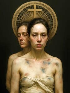 Alcuni volti femminili, segnati da lividi e avvolti in panneggi pallidi, richiamano i martiri delle pale rinascimentali. Lo sguardo spento o carico di dolore richiama la tradizione cristiana della “Pietà”, ma senza consolazione: non vi è redenzione, solo esposizione della fragilità umana. Qui l’aura sacra è ridotta a reliquia estetica, e la spiritualità si trasforma in carne martoriata.