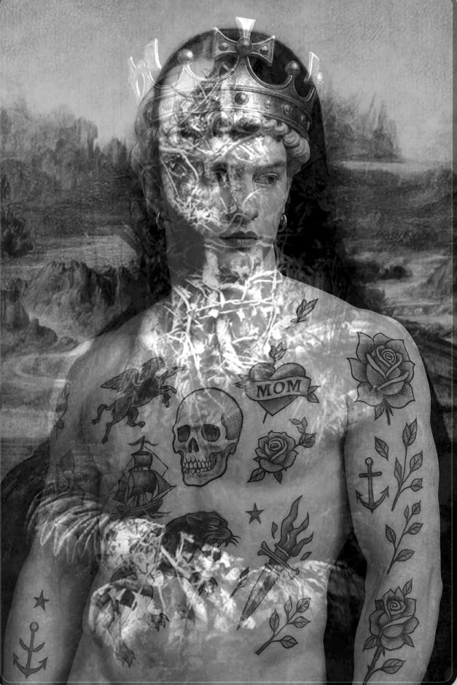 La sovrapposizione visuale mette in dialogo due archetipi: da un lato il volto enigmatico della Gioconda, il dipinto più discusso e decodificato della storia dell’arte; dall’altro, il corpo virile e plastico che richiama la scultura michelangiolesca, forse un David, ora reinterpretato come un moderno Adone tatuato, incoronato, vulnerabile.